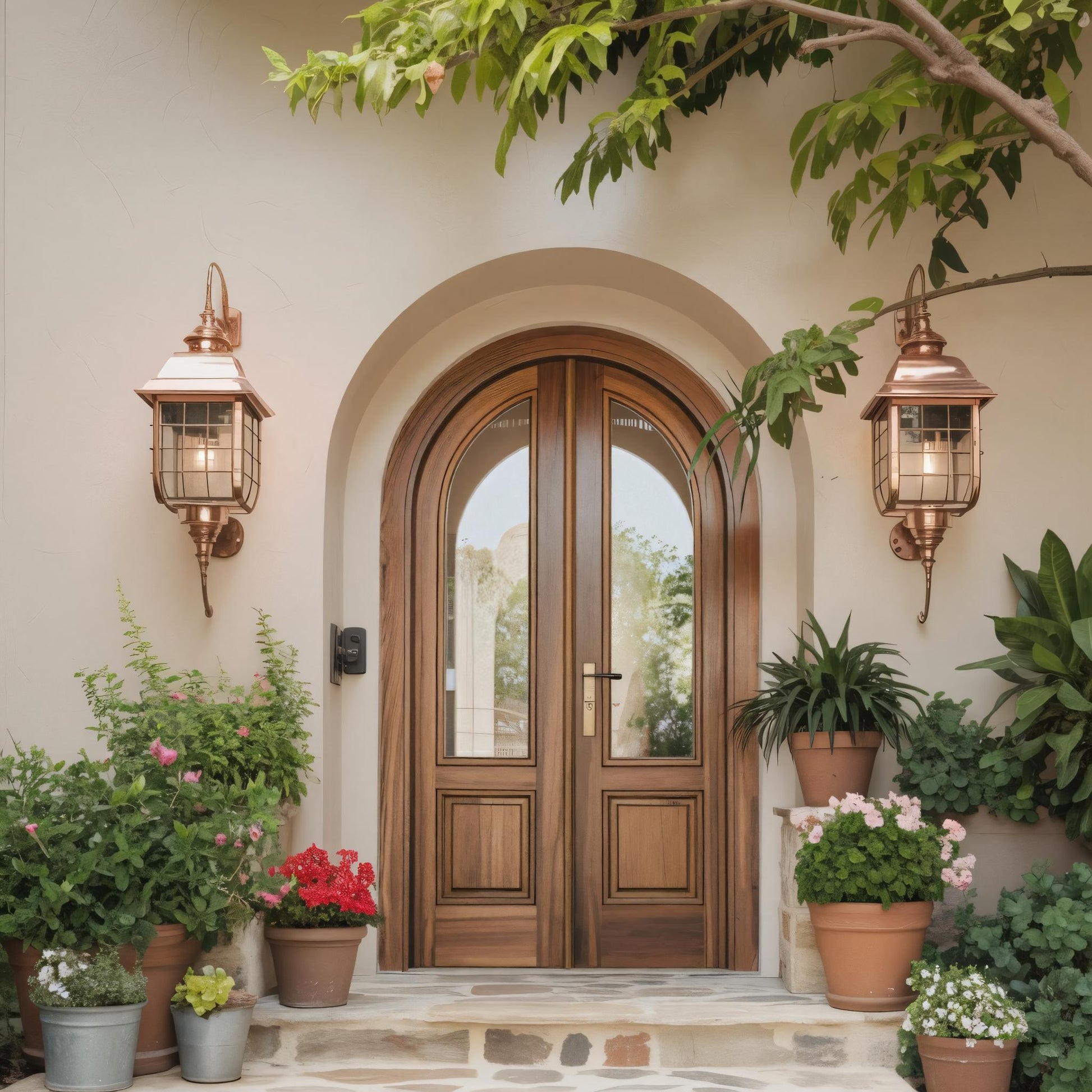 This double-leaf entryway features a sweeping arch that recalls sun-drenched courtyards of the Mediterranean coast. Each panel is framed in solid timber, with inset glass panes that flood your foyer with natural light while preserving privacy. Subtle wrought-iron hardware and a matching threshold anchor the design, marrying traditional Spanish motifs with a balanced, symmetrical form.
